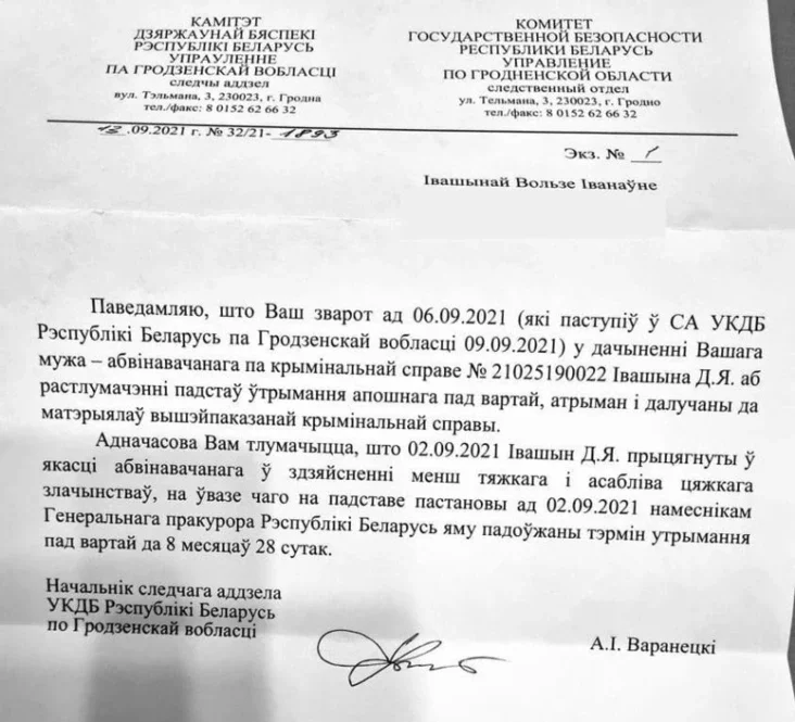 Згодна з дакументам, які даслаў начальнік следчага аддзела УКДБ жонцы палітвязня на яе пісьмовы зварот, 2 верасня Дзянісу Івашыну выстаўленыя два новыя абвінавачанні: у здзяйсненні менш цяжкага і асабліва цяжкага злачынстваў, паведамляе «Новы час».