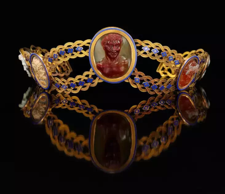 На другой тыяры таксама ёсць эмалевыя ўпрыгожанні. Ювелір размясціў на гэтай дыядэме выразаныя з агату і яшмы партрэты старажытных грэчаскіх багоў — тут можна пабачыць Зеўса, Дыяніса і Гею, а таксама партрэты міфічных істот Медузы і Пана. Лонданскі музей Вікторыі і Альберта, дзе раней часова выстаўлялася тыяра, сцвярджае, што яна магла быць падарункам ад сястры Напалеона Караліны Банапарт.