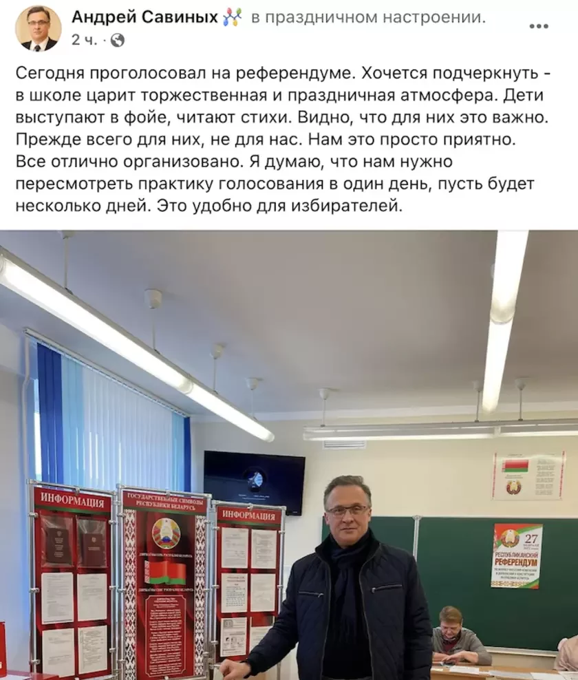 «Сёння прагаласаваў на рэферэндуме, — піша Андрэй Савіных. — Хочацца падкрэсліць — у школе пануе ўрачыстая і святочная атмасфера. Дзеці выступаюць у фае, чытаюць вершы. Відаць, што для іх гэта важна. Перш за ўсё для іх, не для нас. Нам гэта проста прыемна. Усё выдатна арганізавана. Я думаю, што нам трэба перагледзець практыку галасавання ў адзін дзень, хай будзе некалькі дзён. Гэта зручна для выбаршчыкаў».