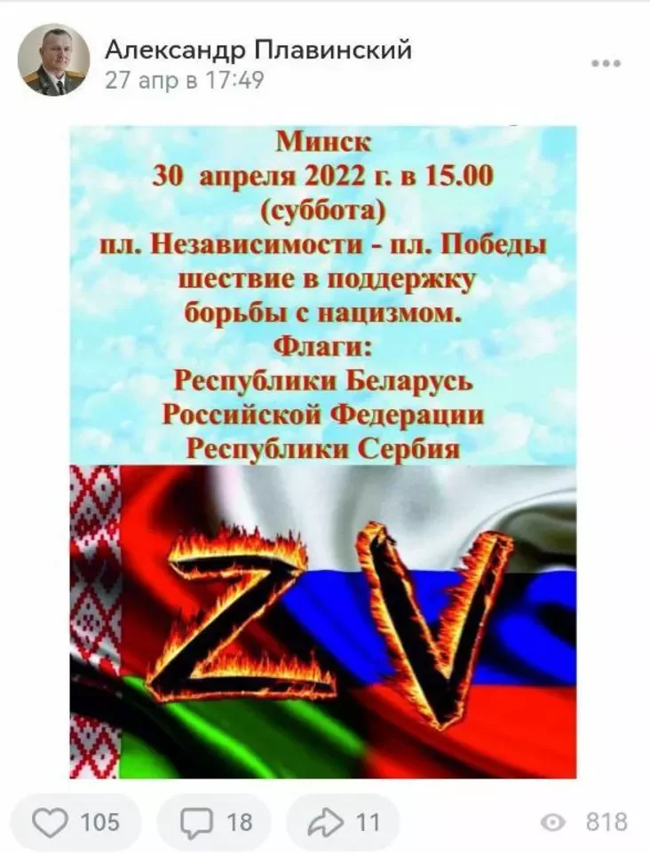 За некалькі дзён да таго ў акаўнце Аляксандра Плавінскага, вядомага сваімі антыгістарычнымі кніжкамі пра Курапаты, з'явілася абвестка, у якой заклікалася акурат у гэты час выйсці на «шэсце ў падтрымку барацьбы з нацызмам». Трэба думаць, гэта яно і было.