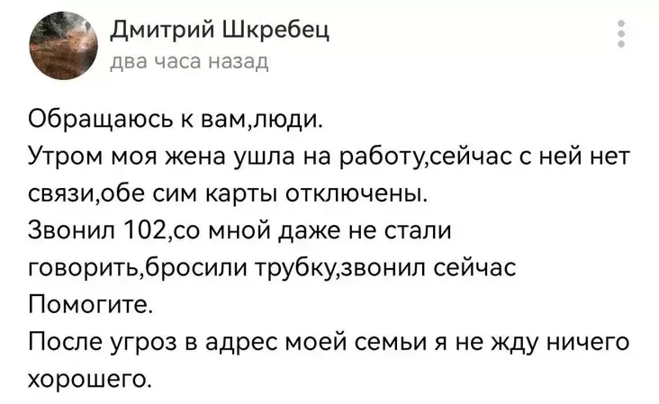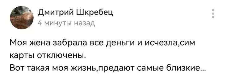 Пасля мужчына напісаў, што яго жонка «забрала ўсе грошы і знікла, сім-карты адключаныя».