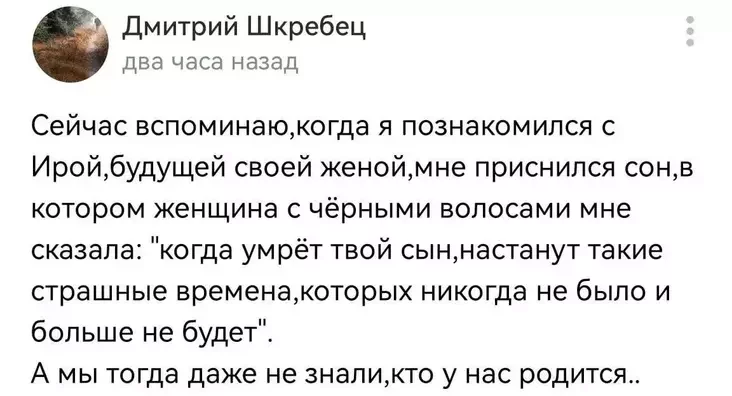 Акрамя таго, Шкрабец згадаў «прарочы сон» пасля знаёмства з жонкай. Яго нібыта папярэджвалі пра «страшныя часы пасля смерці сына».