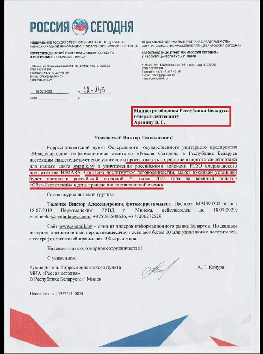 Вядомы расійскі журналіст Аляксандр Няўзораў апублікаваў у сваім тэлеграм-канале копію нібыта звароту кіраўніка беларускага карпункта «Россия сегодня» да міністра абароны Беларусі з просьбай садзейнічаць пастановачнай здымцы сюжэту аб «знішчэнні расійскімі войскамі РСЗА».