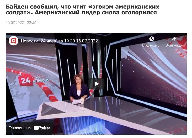 У канцы ліпеня Лукашэнка даў інтэрв’ю агенцтву AFP, у якім заявіў, што заходнія СМІ дэманізуюць і крыўдзяць Пуціна. Маўляў, навошта вы абражаеце Пуціна, мы ж з Байдэна вашага не смяёмся. Але вось як выглядаюць навіны пра амерыканскага прэзідэнта на дзяржаўных тэлеканалах.