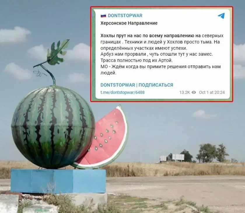 Расійскія франтавыя блогеры паведамілі, што ўкраінская бранятэхніка прарвала расійскую лінію абароны ў раёне так званага «помніка кавуну» ў раёне паселішча Залатая Балка.
