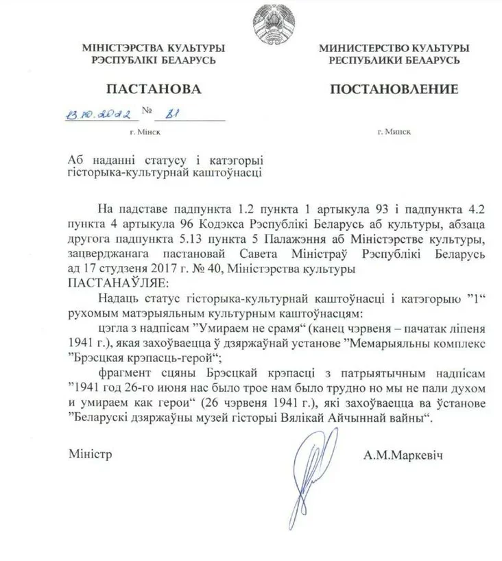 Статус гісторыка-культурнай каштоўнасці надалі цэгле і фрагменту сцяны з Брэсцкай крэпасці