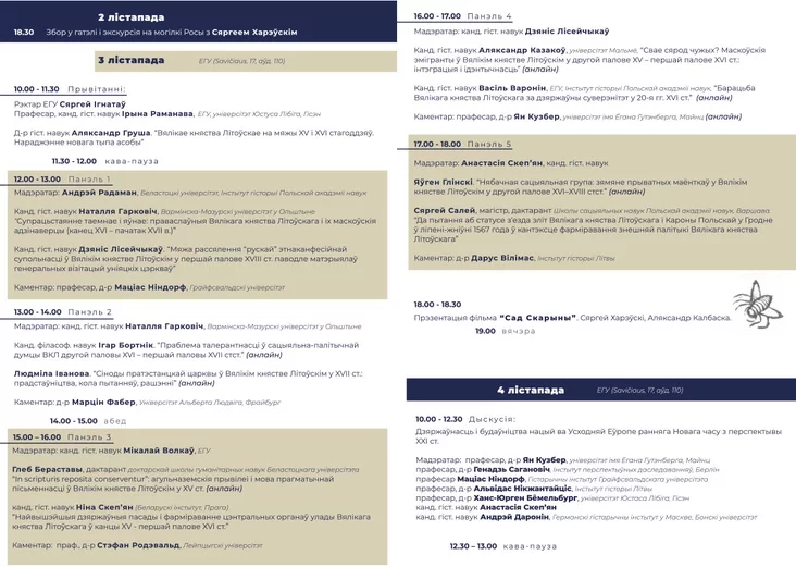 4 лістапада: 10:00 — дыскусія; 13:00 — тэматычныя панэлі; 18:00 — падсумаванне.