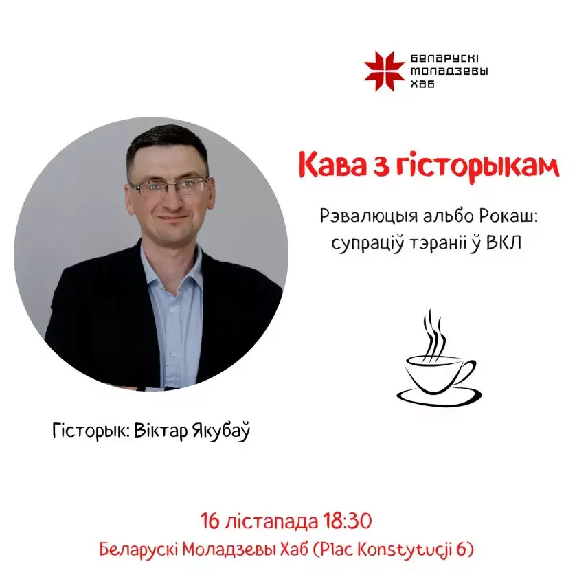 16 лістапада, у сераду, Беларускі моладзевы хаб у Варшаве запрашае на чарговую «каву з гісторыкам». Гэтым разам гісторык Віктар Якубаў распавядзе пра тэорыю і практыку рэвалюцый у гісторыі Еўропы і Беларусі, што было прычынай і хто паўставаў супраць уладаў у традыцыйным грамадстве.