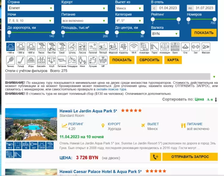 Аптымальны варыянт (першая берагавая лінія і пяць зорак у Хургадзе) у красавіку будзе каштаваць трошкі больш за 3700 рублёў за дваіх, але ж у першым месяцы лета такая ж пуцёўка вырасце ў цане на 600 рублёў.