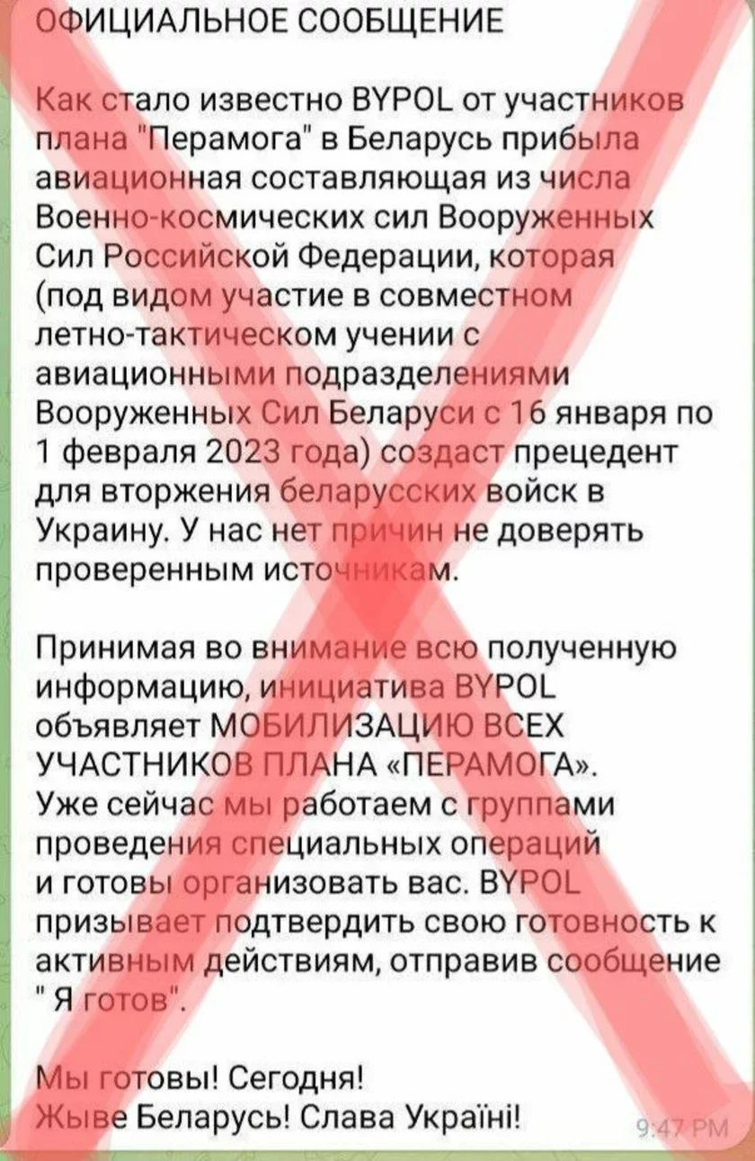 Аб'яднаны пераходны кабінет у сваім канале паведаміў, што сярод карыстальнікаў тэлеграма зноў пашыраецца дэзынфармацыя пра план «Перамога». Ім рассылаюць прапанову пацвердзіць сваю гатоўнасць удзельнічаць у плане і адправіць адпаведнае паведамленне на несапраўдны акаўнт.
