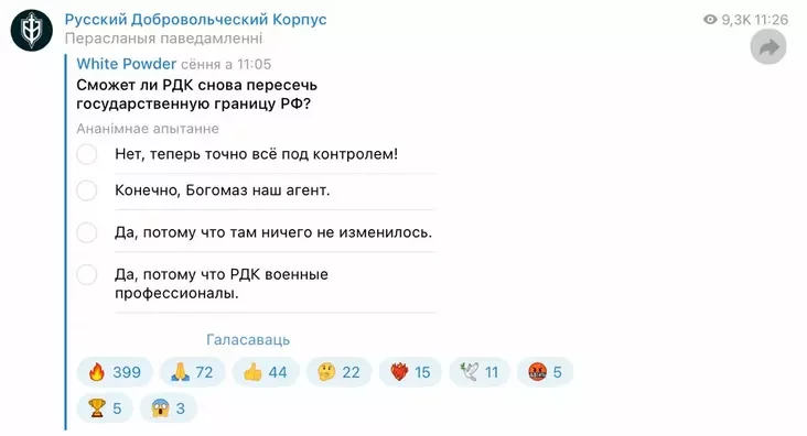 Раней «Рускі добраахвотніцкі корпус» ў сваім тэлеграм-канале апублікаваў апытанку аб шанцах патрапіць у Бранскую вобласць. Праз гадзіну з’явілася паведамленне аб спробах «украінскай ДРГ» трапіць на тэрыторыю вобласці.