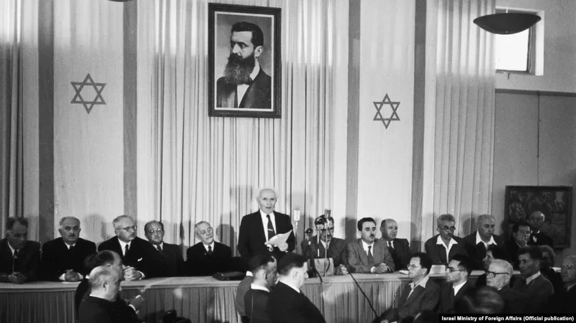 Давід Бэн-Гурыён абвяшчае незалежнасць Ізраіля ў будынку Тэль-Авіўскага мастацкага музея 14 мая 1948 года