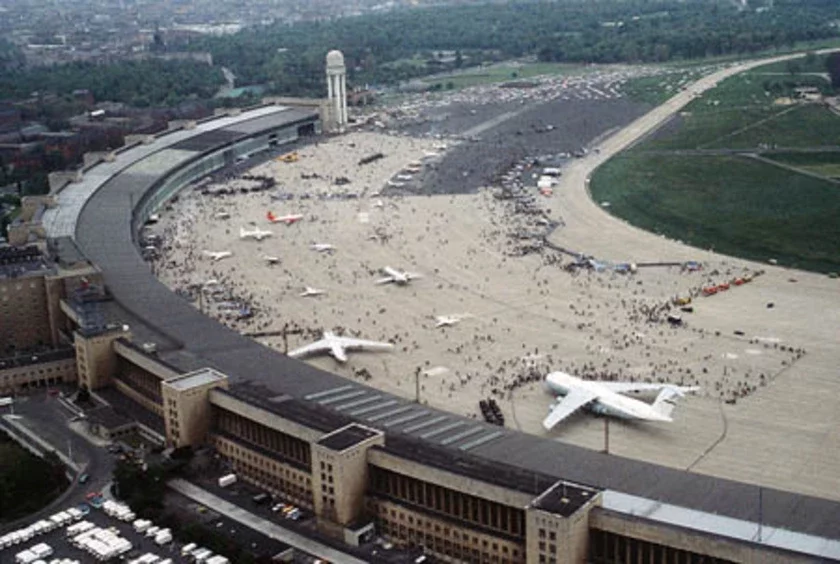 Аэрапорт «Тэмпельгоф» — знакавае для немцаў месца. Яго пабудавалі ў 1923 годзе, тры гады да з'яўлення авіякампаніі «Люфтганза». Будынак аэрапорта дарабілі ўжо нацысты, у 1933. Паводле генеральнага плана забудовы Берліна, вялізны тэрмінал павінны быў адлюстроўваць нацыскую ідэалогію, служыць брамай у звышдзяржаву, дэманстраваць яе тэхналагічную моц. «Тэмпельгоф» быў тады самым вялікім аэрапортам у свеце і адным з самых шыкоўных: яго даўжыня была амаль паўтара кіламетры, пад зямлёй былі зроблены вялізныя плошчы, адведзеныя пад сховішчы, а на зямлі запрашалі да сябе пакупнікоў першыя ў свеце крамы «Д'юці-фры». У час вайны «Тэмпельгоф» служыў цывільным і вайсковым аэрапортам, а пасля Падстамскай дамовы адышоў пад амерыканскую юрысдыкцыю.