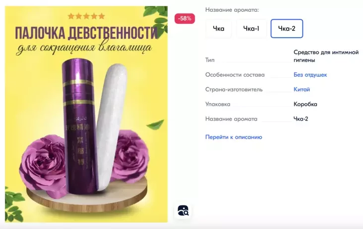 Гэта тавар можна заказаць на Ozon па кошце каля 25 рублёў за штуку. Гэтую палачку прапануюць для «жанчын, якія спазналі радасць мацярынства», і акрамя яе, для звужэння вагіны выкарыстоўваюць таксама капсулы і свечкі.