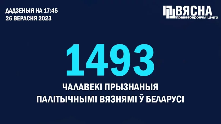 Праваабаронцы з «Вясны» 26 верасня аб'явілі аб прызнанні палітычнымі зняволенымі яшчэ адзінаццаці чалавек. Агульная колькасць палітвязняў у Беларусі, паводле іх версіі, цяпер складае 1493 чалавекі.