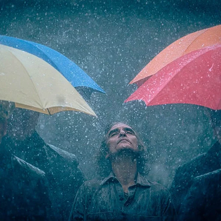 Новы кадр з фільма «Джокер: вар'яцтва на дваіх» з'явіўся ў сеціве. На фота Хаакін Фенікс без клоўнскага грыму стаіць пад дажджом паміж людзьмі з рознакаляровымі парасонамі. Па адной з фанацкіх версій, гэта фрагмент музычнага нумара, якіх будзе нямала ў сіквеле нашумелага «Джокера» 2019 года, піша Tochka.by.