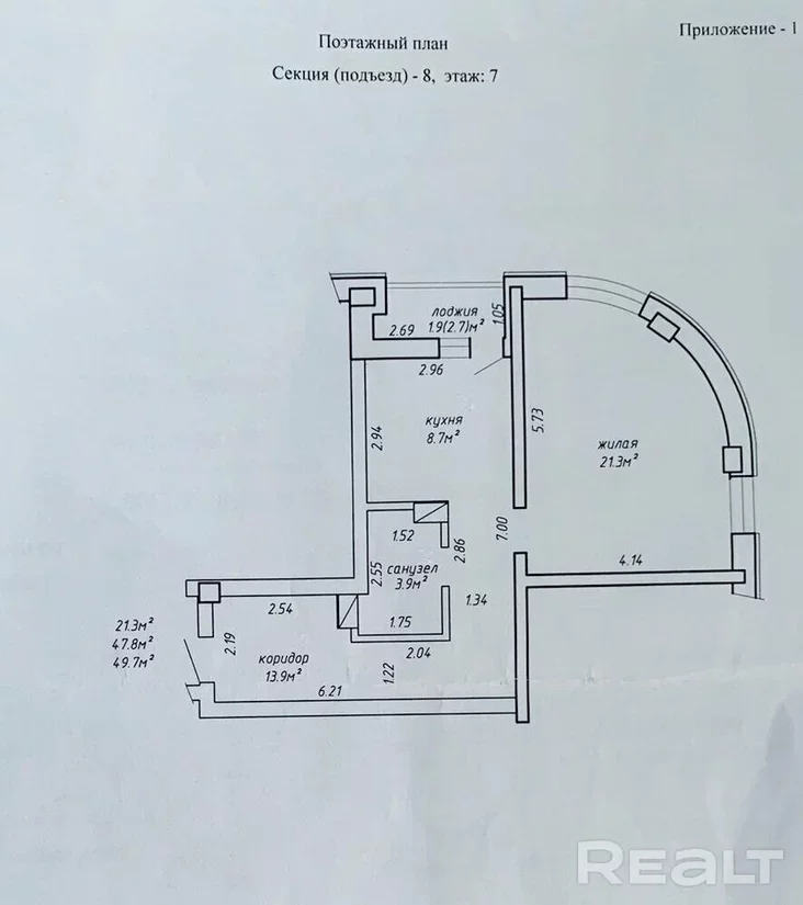 Плошча гэтага жылля складае 49 квадратных метраў. Тут пярэдні пакой, калідор, асобная кухня і жылы пакой. Планіроўка ў кватэры — нестандартная. У жылым пакоі — паўкруглая сцяна і адразу два акны.