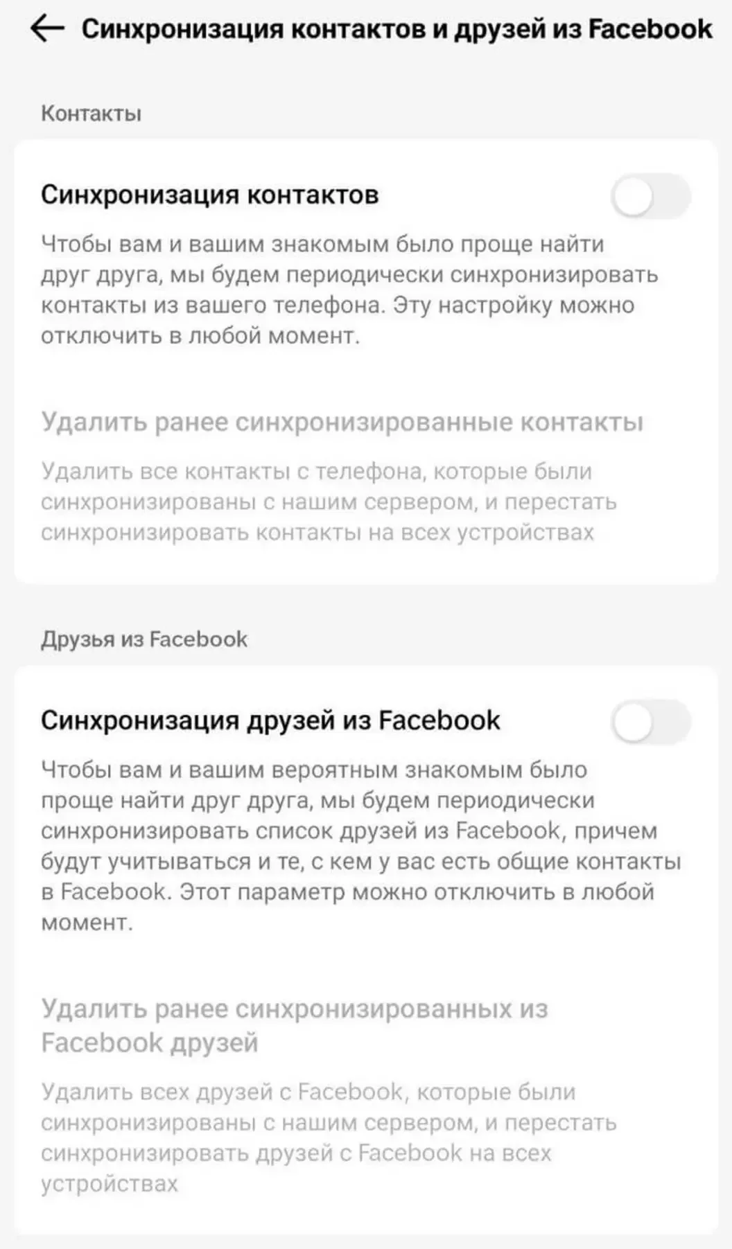 Вярніцеся і перайдзіце ў пункт «Сінхранізацыя кантактаў і сяброў з Facebook». Падумайце, ці хочаце вы, каб людзі з вашай кантактнай кнігі або фрэндліста фэйсбука маглі знайсці вас у тыктоку. Адключыце гэтую опцыю.