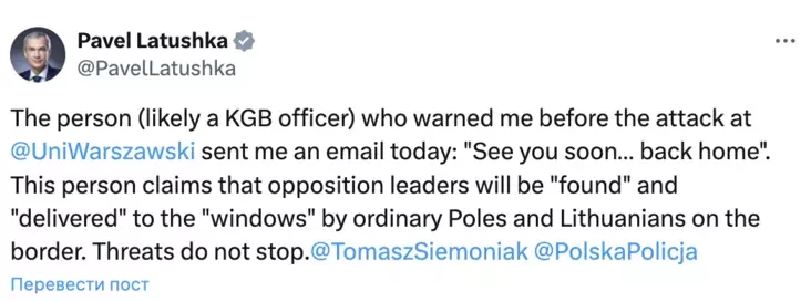 Гэты чалавек сцвярджае, што лідараў апазіцыі «знойдуць» і «даставяць» да «вокнаў» звычайныя палякі і літоўцы на мяжы. Пагрозы не спыняюцца», — напісаў Латушка ў сацсетцы X, пазначыўшы тэгамі польскую паліцыю і віцэ-прэм'ера Польшчы Томаша Семоняка, які курыруе сілавыя структуры.