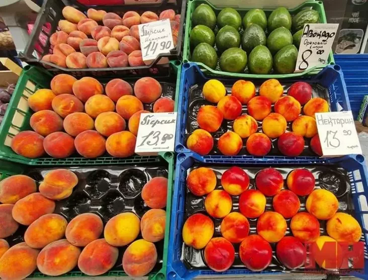Што да садавіны. Авакада ацэньваецца ў 8−10,9 рубля за штуку. Нектарыны абыходзяцца ад 13 да 28 рублёў за кілаграм, персікі — ад 4 рублёў за узбецкія да 25 за іспанскія. Абрыкосы каштуюць 5−25 рублёў, грушы — 10−19,90, яблыкі — 2−10.
