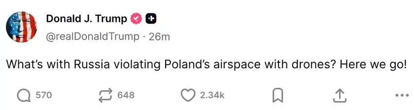 «Што там з Расіяй, якая парушыла польскую паветраную прастору дронамі? Here we go!», — напісаў Трамп.