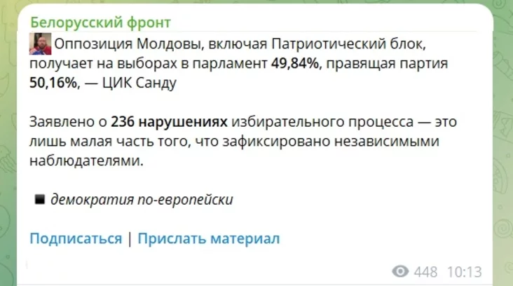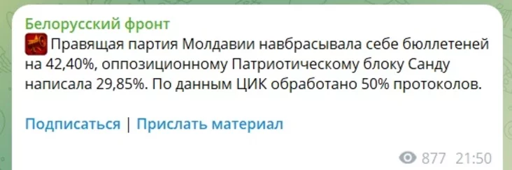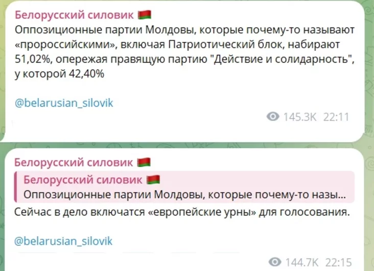 «Апазіцыйныя партыі Малдовы, якія чамусьці называюць «прарасійскімі», уключаючы «Патрыятычны блок», набіраюць 51,02%, пераганяючы правячую партыю «Дзеянне і салідарнасць», у якой 42,40%», — сінхронна паведамляў «Белорусский силовик».