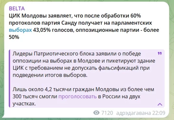 «ЦВК заяўляе, што пасля апрацоўкі 60% пратаколаў партыя Санду атрымлівае на парламенцкіх выбарах 43,05% галасоў, апазіцыйныя партыі — звыш 50%. Лідары Патрыятычнага блоку заявілі аб перамозе апазіцыі на выбарах у Малдове і пікетуюць будынак ЦВК з патрабаваннем не дапусціць фальсіфікацый пры падвядзенні вынікаў выбараў», — пісала БелТА. Пра колькасць удзельнікаў пікета БелТА сціпла маўчала.