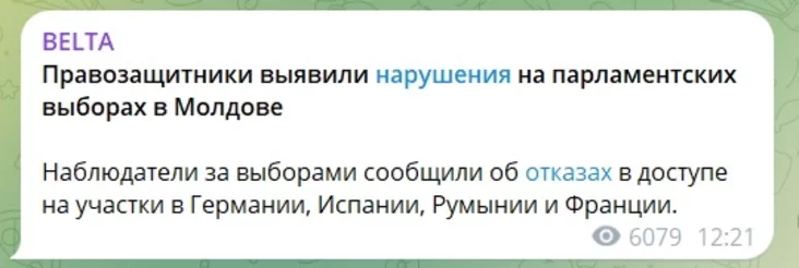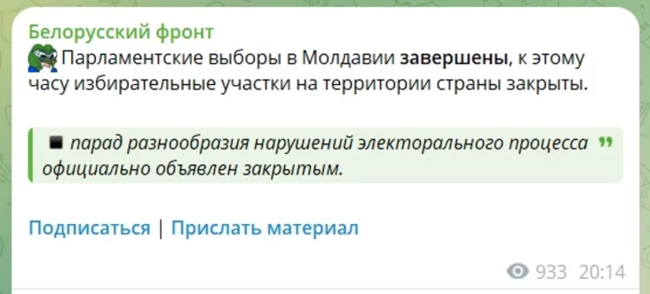 «Парламенцкія выбары ў Малдавіі завершаныя, да гэтага часу выбарчыя ўчасткі на тэрыторыі краіны закрытыя. «Парад разнастайнасці парушэнняў электаральнага працэсу» абвешчаны закрытым».