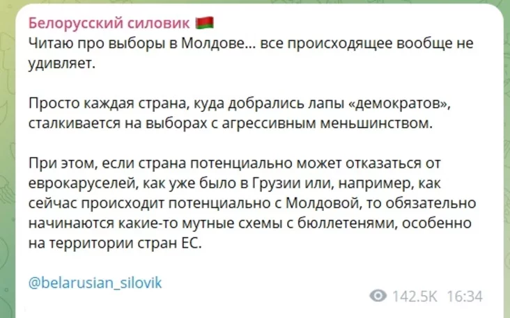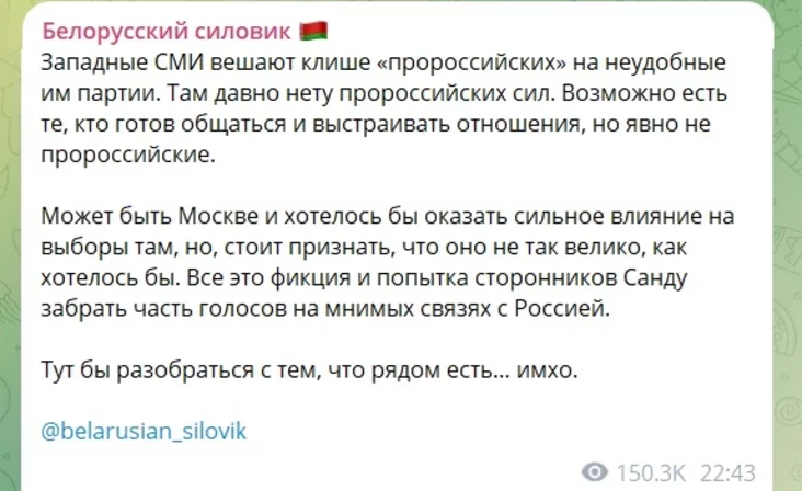 Крыху пазней «Белорусский силовик» дадаў, што ў Малдове «даўно няма прарасійскіх сіл», а выраз «прарасійскія» — клішэ, якое «заходнія СМІ навешваюць на нязручныя ім партыі».