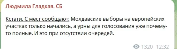 «З месцаў паведамляюць: малдаўскія выбары на еўрапейскіх участках толькі пачаліся, а скрынкі для галасавання ўжо чамусьці поўныя. І гэта пры адсутнасці чэргаў».