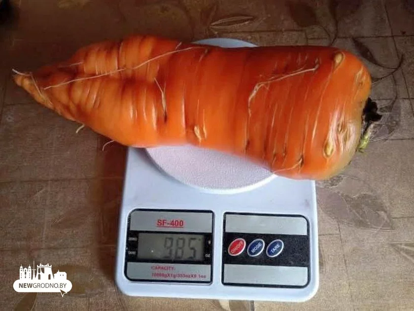 Падчас збору ўраджаю яна звярнула ўвагу на плод незвычайна вялікага памеру. Для праверкі моркву паклалі на вагі. Вага склала 985 грамаў!
