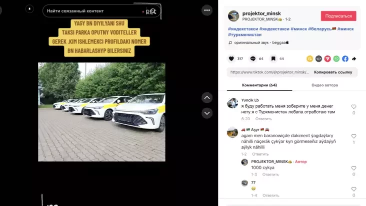 Сярод працоўных мігрантаў з краін Сярэдняй Азіі нямала таксістаў. Іх шукаюць у тым ліку праз сацыяльныя сеткі. Напрыклад, можна патрапіць на акаўнт у тыктоку, які вядзецца на туркменскай і дзе рэкламуецца праца ў таксі.