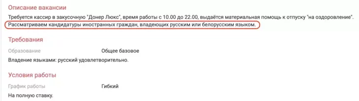 «Вакансія даступная для замежнікаў з веданнем рускай мовы», — пазначана ў апісанні.