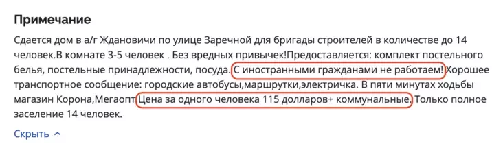 За 15 рублёў на суткі ($150 на месяц) прапануюць ложка-месцы ў катэджы ў Мінску, разлічаным на пражыванне 30 чалавек. У гэтую суму ўваходзяць камунальныя паслугі, змена бялізны двойчы на месяц, бытавая хімія для кухні і гігіенічныя сродкі.