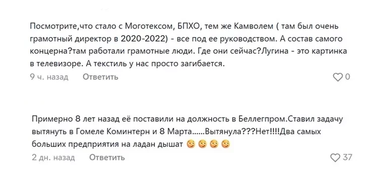 «Паглядзіце, што стала з «Магатэксам», БВБА (Баранавіцкім вытворчым баваўняным аб'яднаннем — НН), тым жа «Камволем» (там быў вельмі талковы дырэктар у 2020—2022) — усё пад яе кіраўніцтвам. А склад самога канцэрна? Там працавалі талковыя людзі. Дзе яны цяпер? Лугіна — гэта карцінка ў тэлевізары. А тэкстыль у нас проста загінаецца».