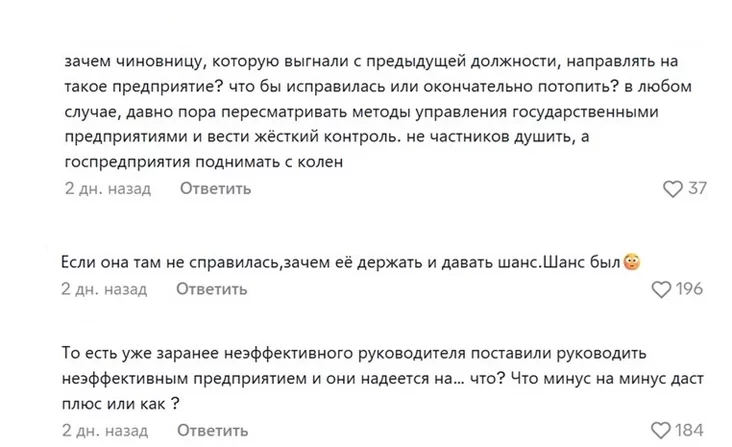 «Навошта чыноўніцу, якую выгналі з папярэдняй пасады, накіроўваць на такое прадпрыемства? Каб выправілася ці канчаткова патапіць? У любым выпадку, даўно час пераглядаць метады кіравання дзяржаўнымі прадпрыемствамі і весці жорсткі кантроль. Не прыватнікаў душыць, а дзяржпрадпрыемствы падымаць з каленяў».