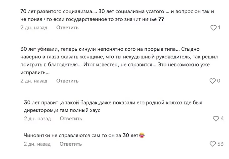 «30 гадоў кіруе, а такі бардак. Нават паказалі яго родны калгас, дзе быў дырэктарам, і там поўны хаос».