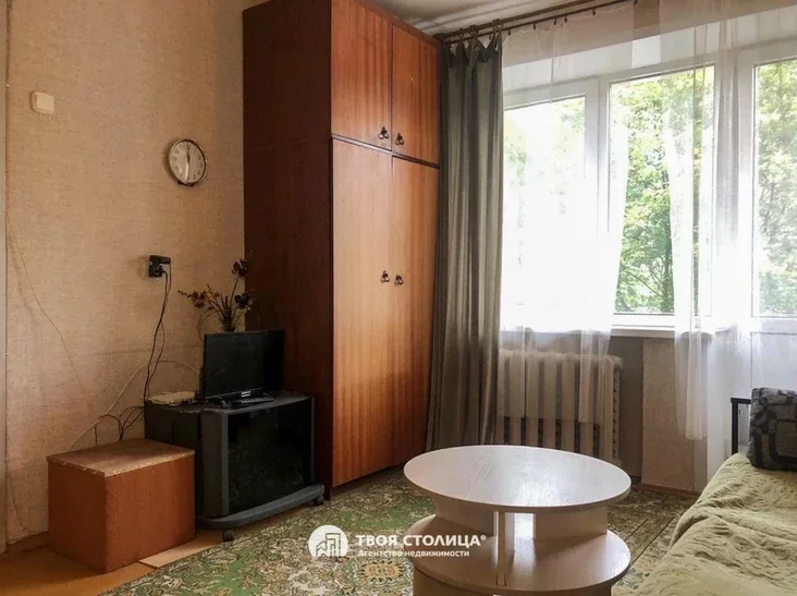 Асноўны пакой займае амаль 12 кв.м. Тут стаіць вялікая канапа, шафа, паліцы для кніг. Абстаноўка цалкам прыдатная для жыцця — тут зроблены еўрарамонт, але даволі акуратны.