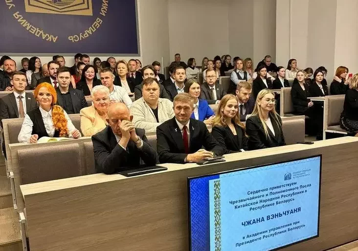 Мсціслаў Мекта ў складзе дэлегацыі трэцяга эшалона ўлады, першы злева, у адным шэрагу з Вольгай Чамаданавай. Фота: Скрыншот Youtube