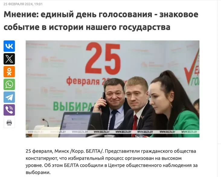 «За час датэрміновага галасавання нашымі назіральнікамі не зафіксавана ніякіх парушэнняў», — запэўніваў рэцыдывіст са старонак БелТА.