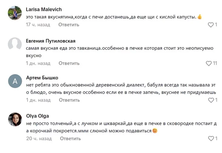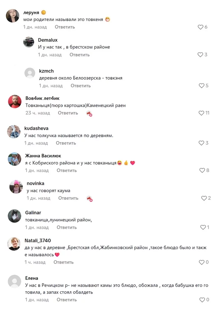 У каментарыях — сапраўдная пераклічка паміж гледачамі. Яны дзеляцца назвамі гэтай стравы ў розных мясцовасцях.