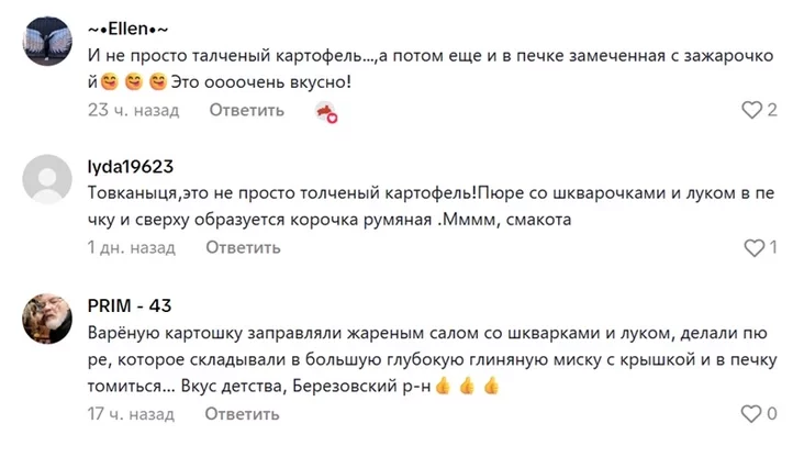 «Не проста тоўчаная, а з цыбуляй і скваркай, ды яшчэ [калі] ў печы пастаіць, ды скарыначкай парыецца. Ммм. Слінай можна падавіцца».