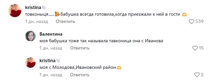 «Товканыця…. Бабуля заўсёды гатавала, калі прыязджала да яе ў госці», — з настальгіяй згадвае адна глядачка. І яе лайкамі падтрымала амаль 550 іншых.