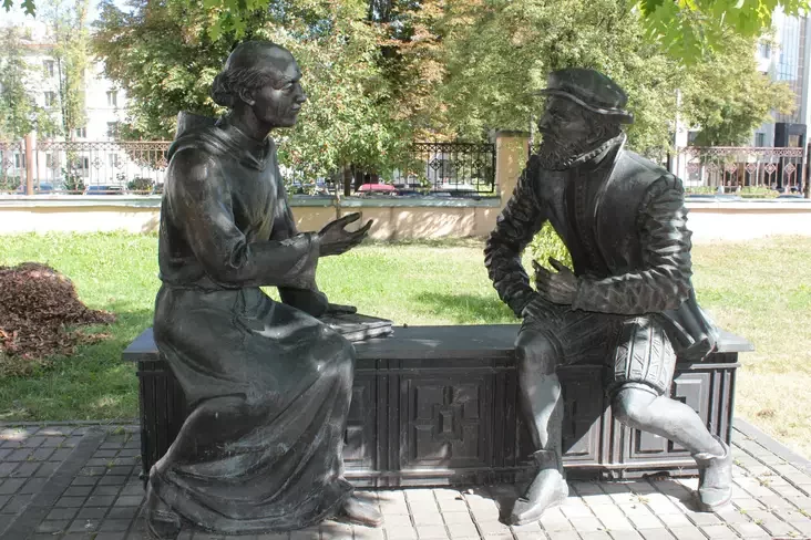 Кампазіцыя «Дыспут: В. Цяпінскі і С. Будны» ва ўнутраным дворыку БДУ. Скульптар І. Голубеў, 2000 г.