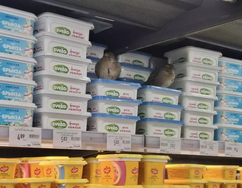 У краме «Суседзі» ў Новай Баравой ужо некалькі гадоў жывуць вераб’і. Пра гэта паведаміла жыхарка вёскі Копішча, якая даслала ў рэдакцыю pristalica.by фота і відэа: на кадрах відаць, як птушкі сядзяць проста на сырах у гандлёвым аддзеле.