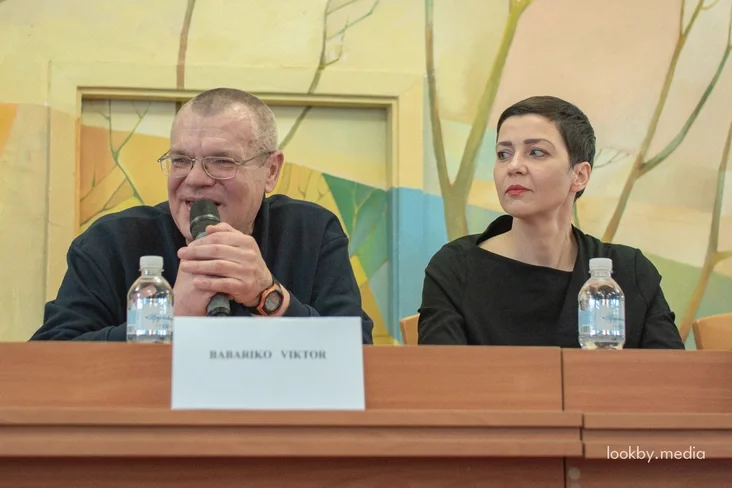 Віктар Бабарыка і Марыя Калеснікава падчас прэс-канферэнцыі 14 снежня 2025 года. Фота: LookByMedia