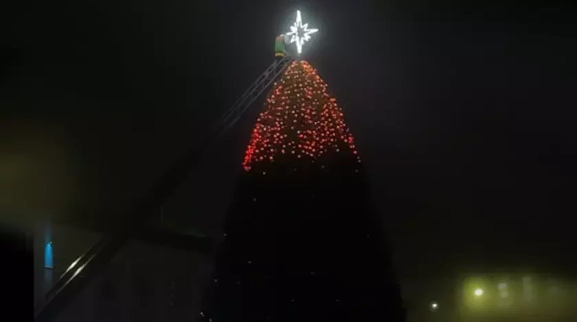 У Баранавічах галоўную навагоднюю ёлку запальваў эльф на пажарнай драбіне ВІДЭА