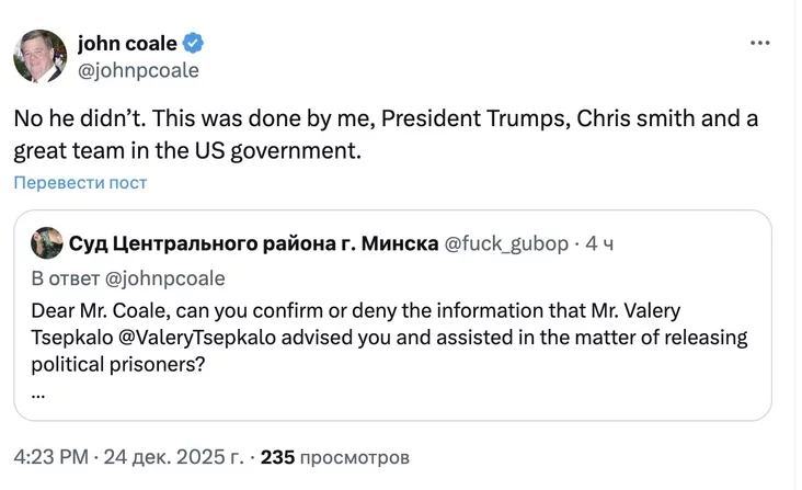 Спецыяльны прадстаўнік прэзідэнта ЗША Джон Коўл у сацсетцы X абвергнуў сцвярджэнне аднаго з удзельнікаў прэзідэнцкай выбарчай кампаніі 2020 года, а цяпер дарадцы Албанскай інвестыцыйнай карпарацыі Валерыя Цапкалы, што нібыта той аказваў Коўлу кансультатыўныя паслугі ў справе вызвалення беларускіх палітычных зняволеных.
