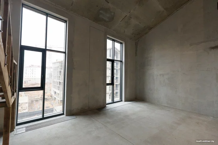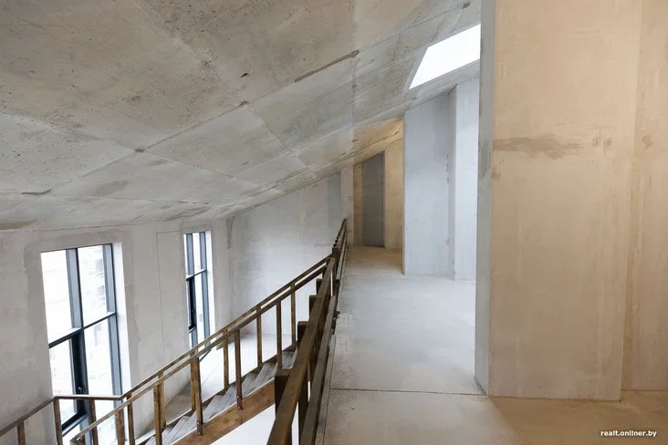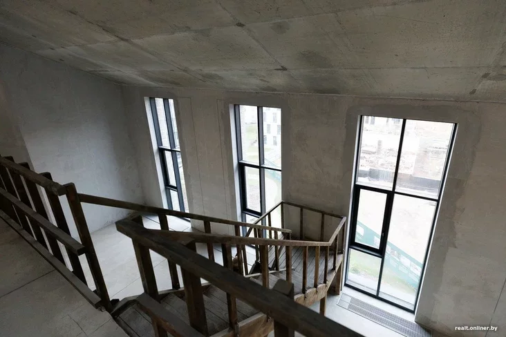 А цяпер ныраем у пентхаус: два ўзроўні (уваходы арганізаваны з пятага і шостага паверхаў), 196 квадратных метраў, цікавае акно прама ў даху. Асобная тэма — высокія, вельмі высокія вокны ў зоне кухні-гасцёўні (ад яе можна спакойна «адрэзаць» ізаляваную спальню, і ніхто нават не заўважыць). Мыць такія вокны — тая яшчэ задача. Але забудоўшчык удакладняе, што двойчы ў год яна будзе вырашана сіламі абслугоўваючай арганізацыі, якая сама найме прамысловых альпіністаў і забяспечыць чысціню.