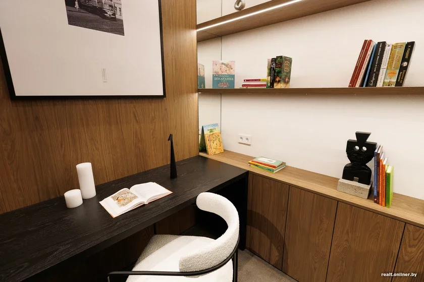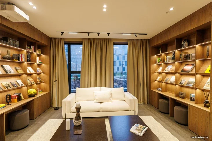 — Гэту прастору мы праектавалі як «трэцяе месца» — нешта паміж працай і домам, — тлумачыць кіраўнік аддзела продажаў квартала Depo Аляксандра Хацяновіч. — Тут жыхары дома змогуць сустракаць гасцей, праводзіць працоўныя званкі, нават прызначаць нейкія сустрэчы. Ну і, вядома, чытаць кнігі. Мы разам з праектам Arzamas пастараліся сабраць неверагодную калекцыю, каб кожны змог знайсці нешта для сябе.